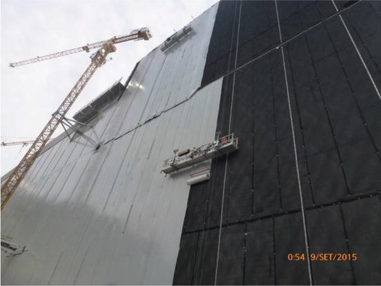 Из-за организационных проблем у генерального подрядчика гидроизоляцию наклонного участка пришлось выполнять уже после завершения вертикального участка. Работы по гидроизоляции цементационной плиты и вертикальной части были выполнены в 2011 году (рисунок 5, справа), а наклонного участка — в 2012 году (рисунок 6, слева). Общая площадь гидроизоляции составила 1162 м² на наклонном участке и 2124 м² — на вертикальном.