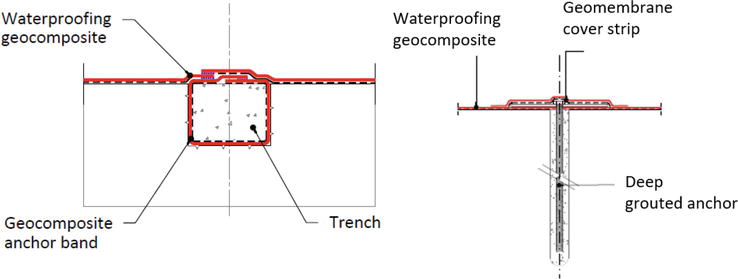 На плотинах, где отделочный слой не формируется из экструдированных пористых оголовков, анкерная система верховой грани, в зависимости от конкретных методов строительства и типа основания, может выполняться при помощи траншей или глубинных анкеров (рисунок 9), расположенных по индивидуальной схеме, определяемой величиной подъёмных воздействий. При использовании траншей анкерные ленты из геокомпозита заделывают в траншеи, вырытые в уплотнённом основании, образуя непрерывные анкерные линии; траншеи обычно заполняют дренирующим материалом (пористый бетон или крупнофракционный грунт), а геокомпозит приваривают к анкерным лентам. Система глубинных анкеров включает анкеры, закреплённые цементным раствором, или грунтовые анкеры типа Duckbill, которые забиваются в насыпь для обеспечения требуемого сопротивления выдергиванию. Геокомпозит анкеруют к поверхности откоса путём прижатия и зажима над анкерами; водонепроницаемость в точках пересечения анкеров и геокомпозита обеспечивают диск из нержавеющей стали, защитный геотекстиль и накрывающая полоска геомембраны.