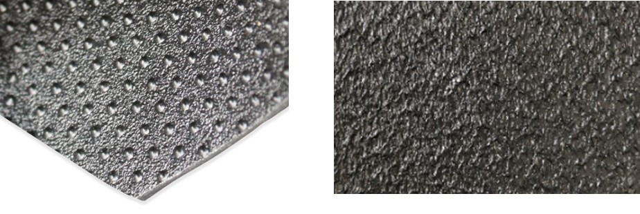 Рисунок 1: Поверхность структурированной геомембраны из ПЭВП с равномерным тиснением (слева — регулярный рисунок выступов, справа — текстура, созданная азотом на геомембране, изготовленной методом раздува)